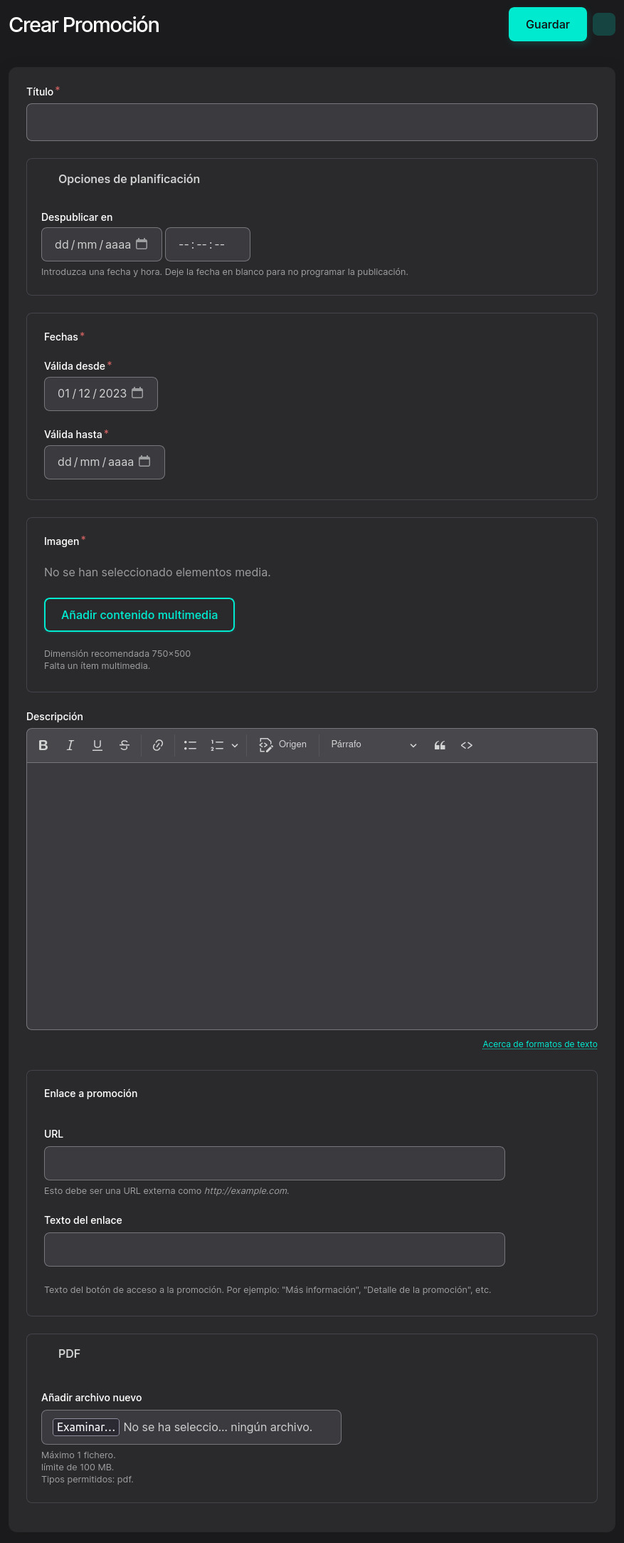 Dentro de la promoción tenemos como campos obligatorios: Título, fechas de valided de la promoción e imagen.