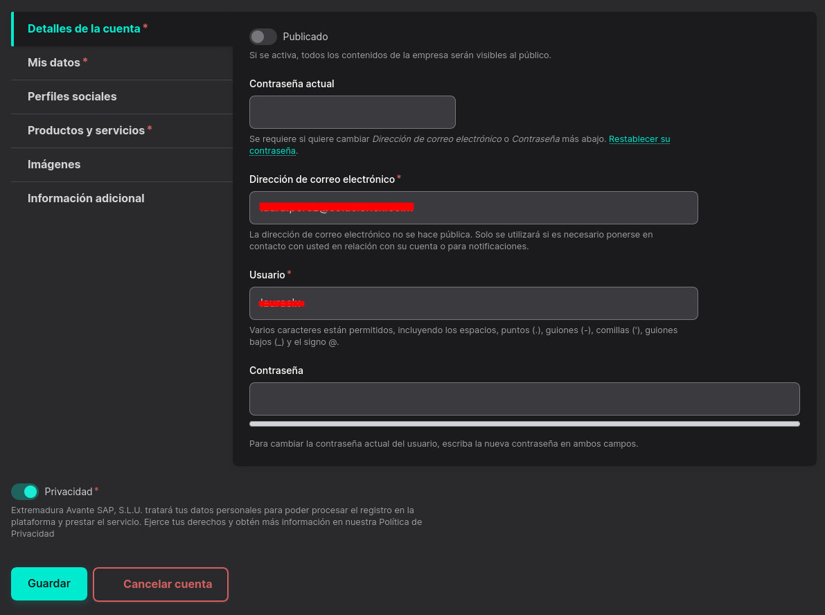 En la primera pestaña "Detalles de la cuenta" podrás actualizar tu contraseña, la dirección de correo electrónico y tu nombre de usuario.