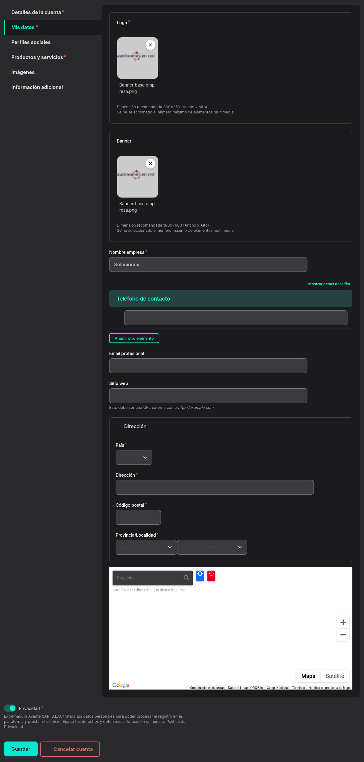 En la segunda pestaña "Mis datos" podrás actualizar tu logo, el banner publicitario, el nombre de la empresa, el email profesional, la dirección de su sitio web y la dirección fiscal.