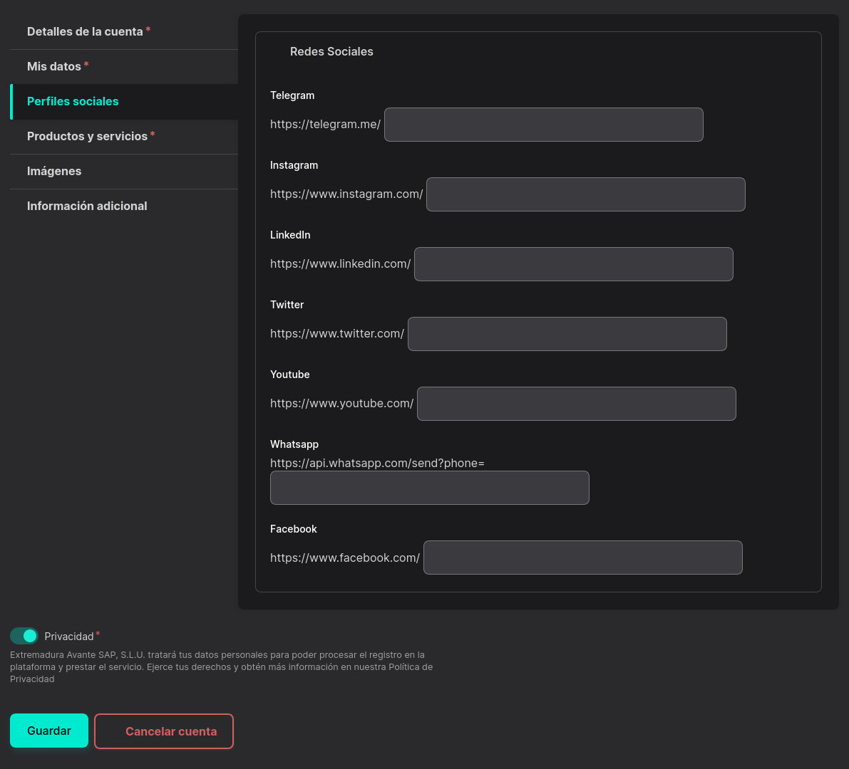 En la tercera pestaña "Perfiles sociales" podrás actualizar todos tus perfiles sociales y Whatsapp.
