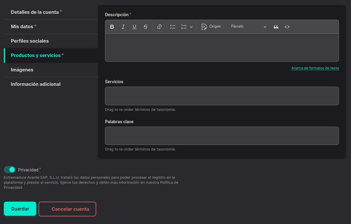 En la cuarta pestaña "Productos y servicios" podrás actualizar la descripción de tu empresa, los servicios ofertados y añadir palabras clave para su empresa.