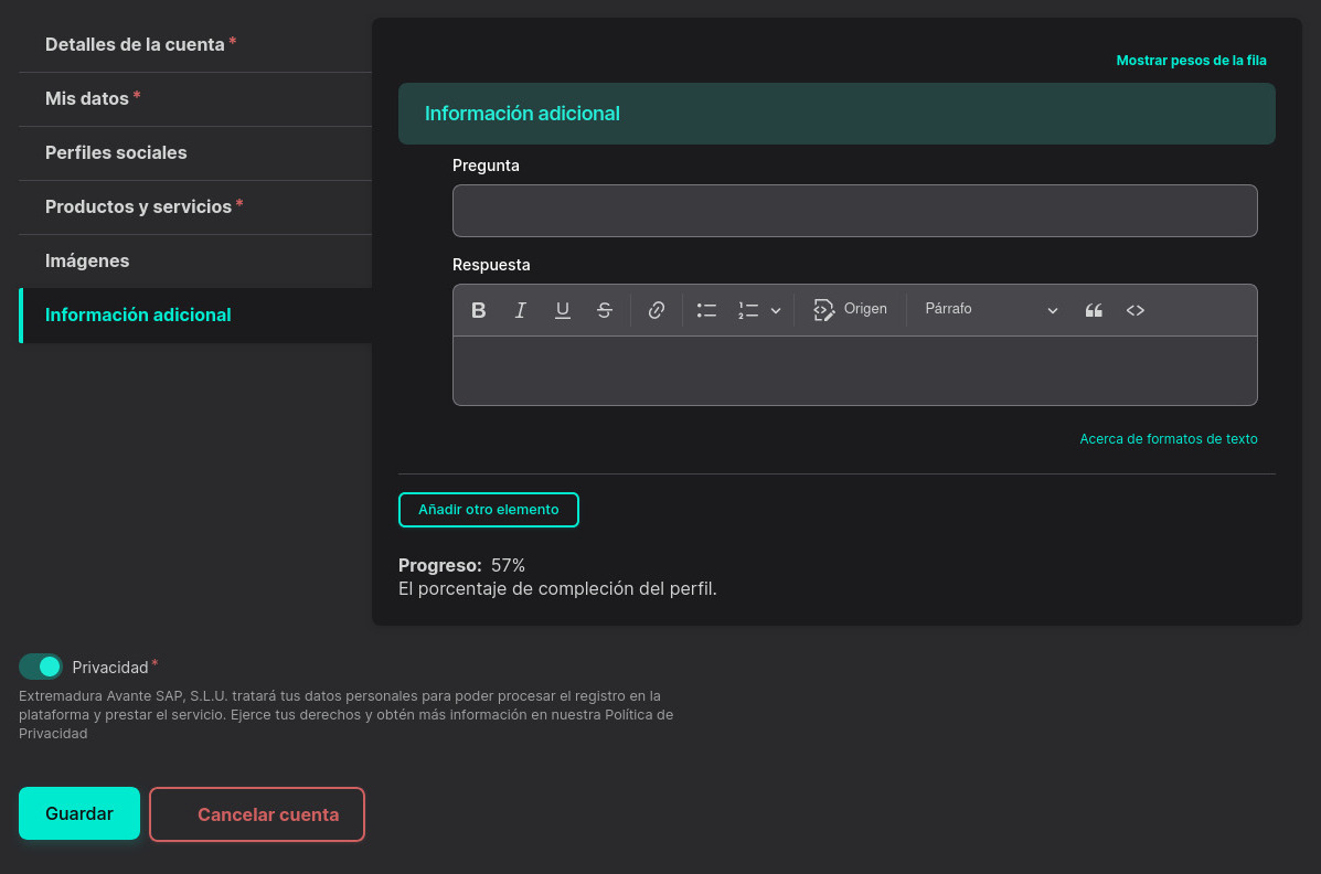 En la sexta y última pestaña "Información adicional" podrás actualizar una relación de preguntas/respuestas para dar a conocer mejor la empresa, sus productos y sus servicios.
