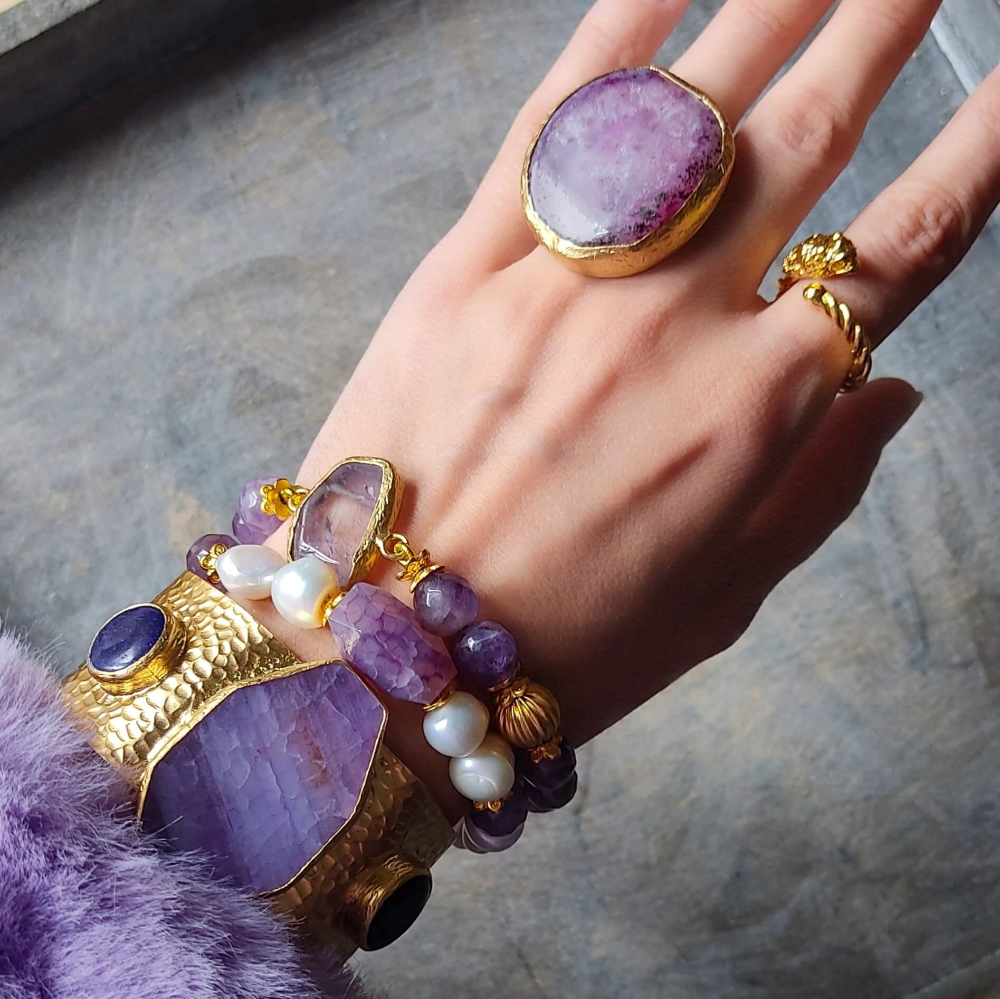 Utilizamos Piedras Semipreciosas, Perlas Cultivadas, Peltre, Latón, Plata y Bronce bañados en Oro de 18K.