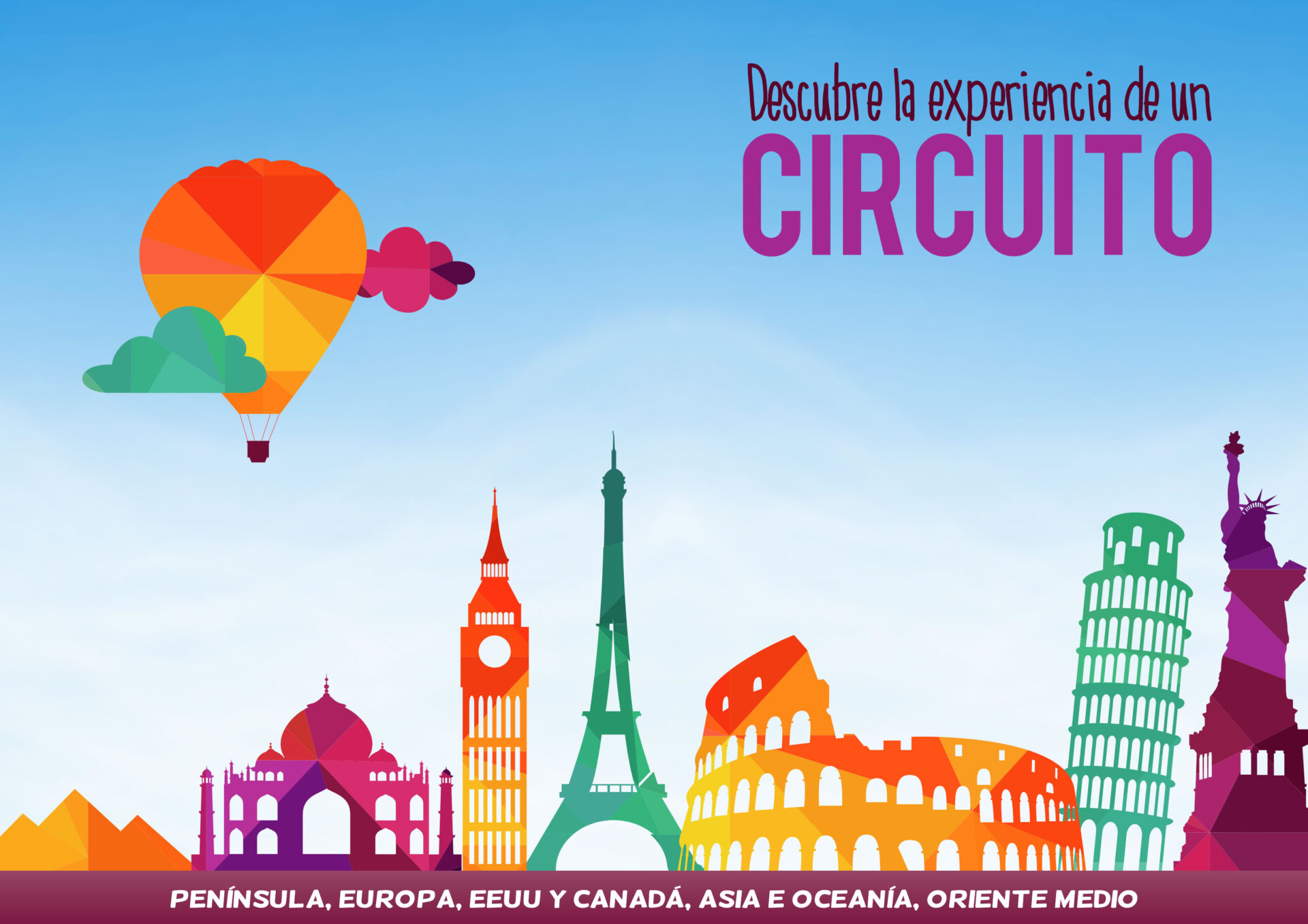 Ofrecemos una amplia y completa oferta de viajes: Paquetes, Circuitos, Excursiones, Cruceros, Escapadas, Grandes Viajes,… y todas las opciones en hoteles y servicios de transporte ( vuelos, trenes, ferries, rent a car,…)